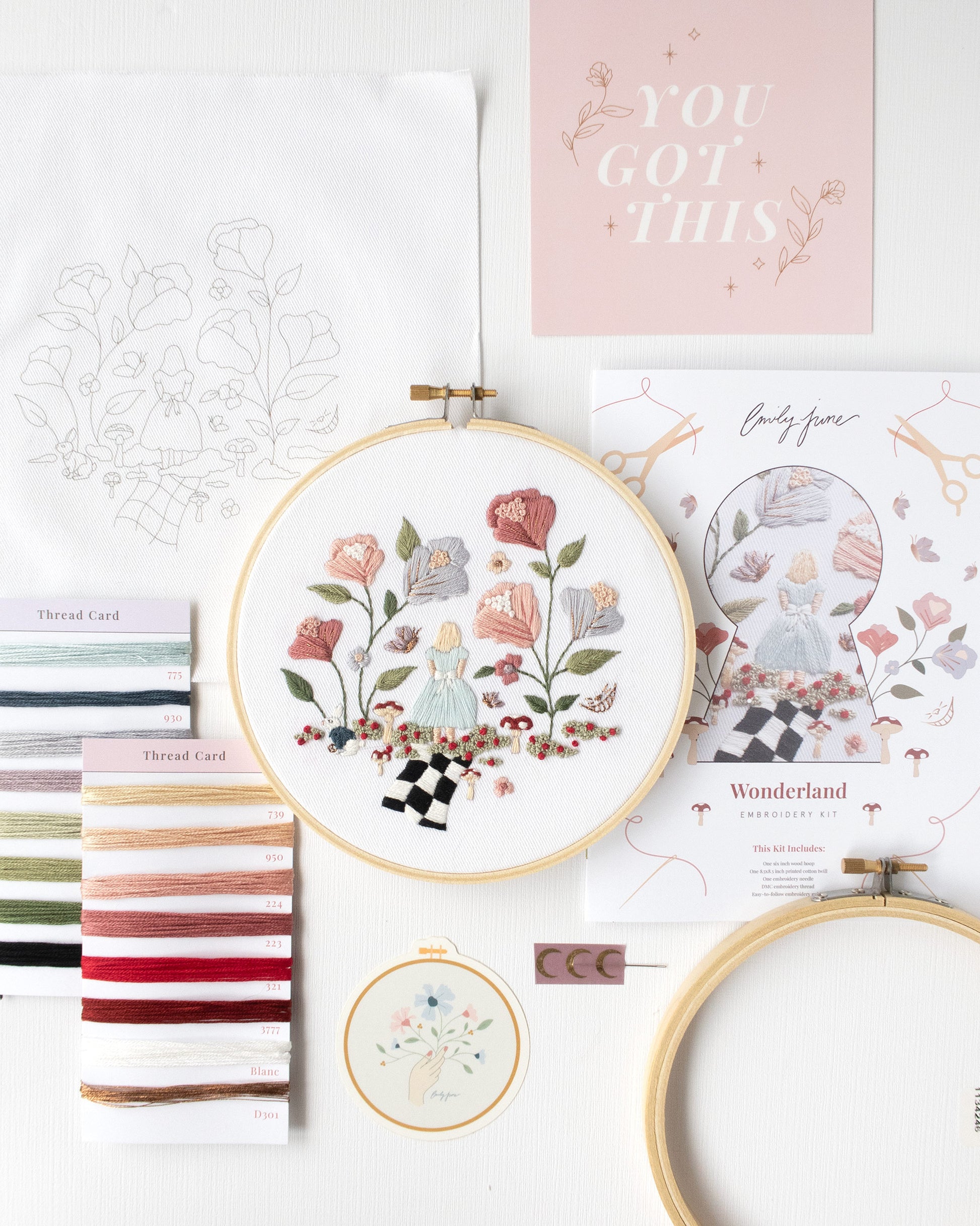 Celebrate Lewis Carrol's timeless classic, Alice in Wonderland, with this hand embroidery kit featuring whimsical details and colors. Stitch everything from tiny mushrooms, the white rabbit, the transformed butterfly, the Cheshire cat grin, Alice, to the talking flowers and more!