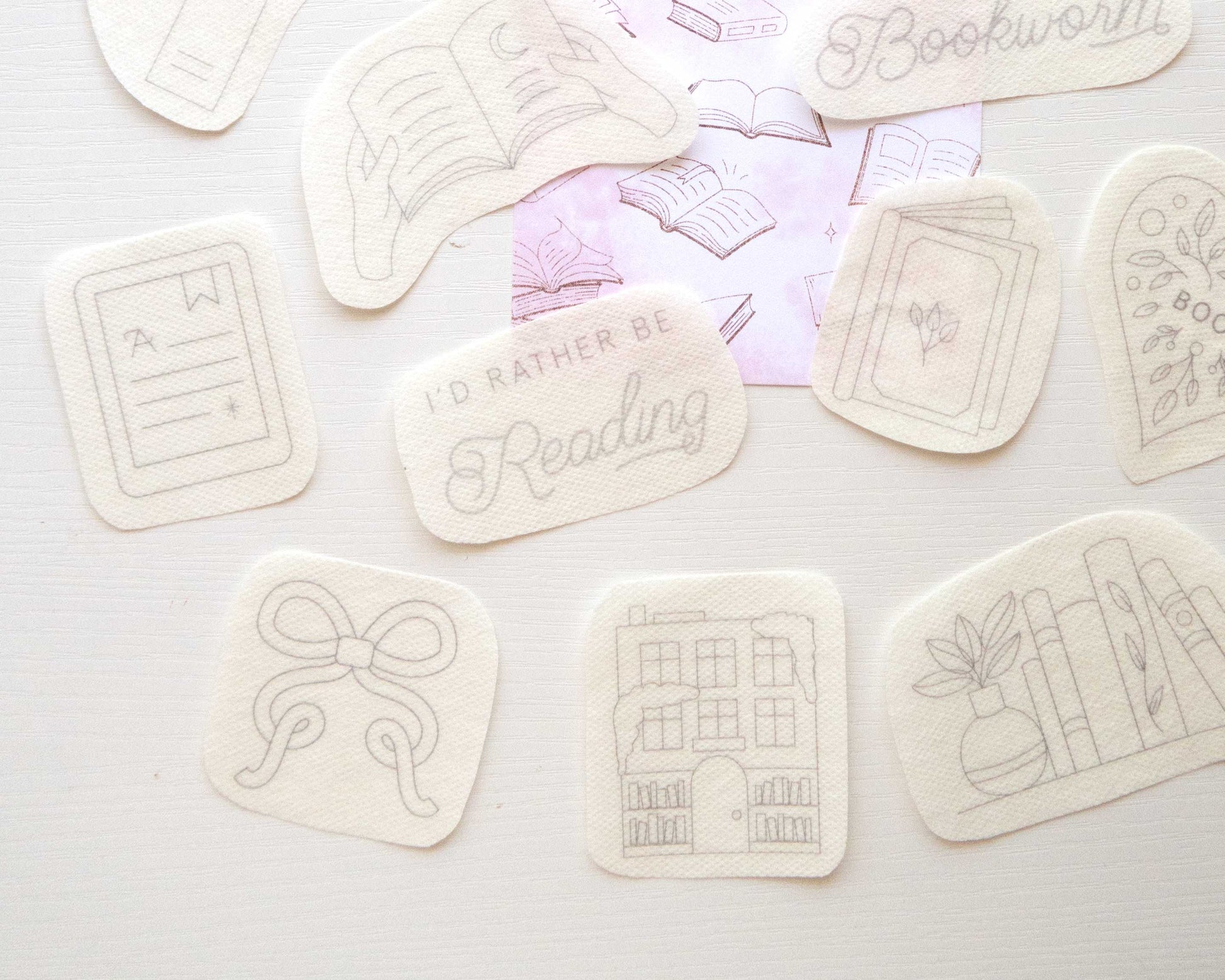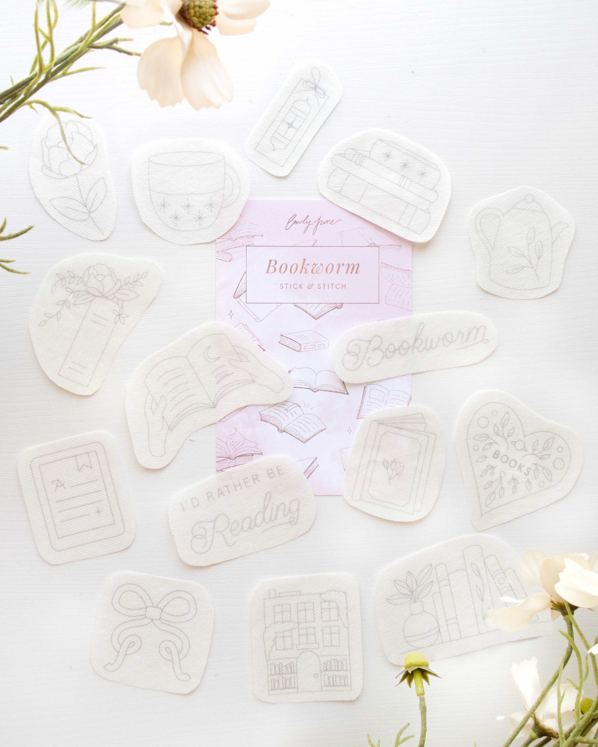 This Bookworm themed hand embroidery stitch and stick pack comes with 10 fanciful designs that are ready to stitch on any clothing, accessory, or small hoop that you may desire. Simply peel the backing away, stick to your desired fabric, stitch, and rinse away.