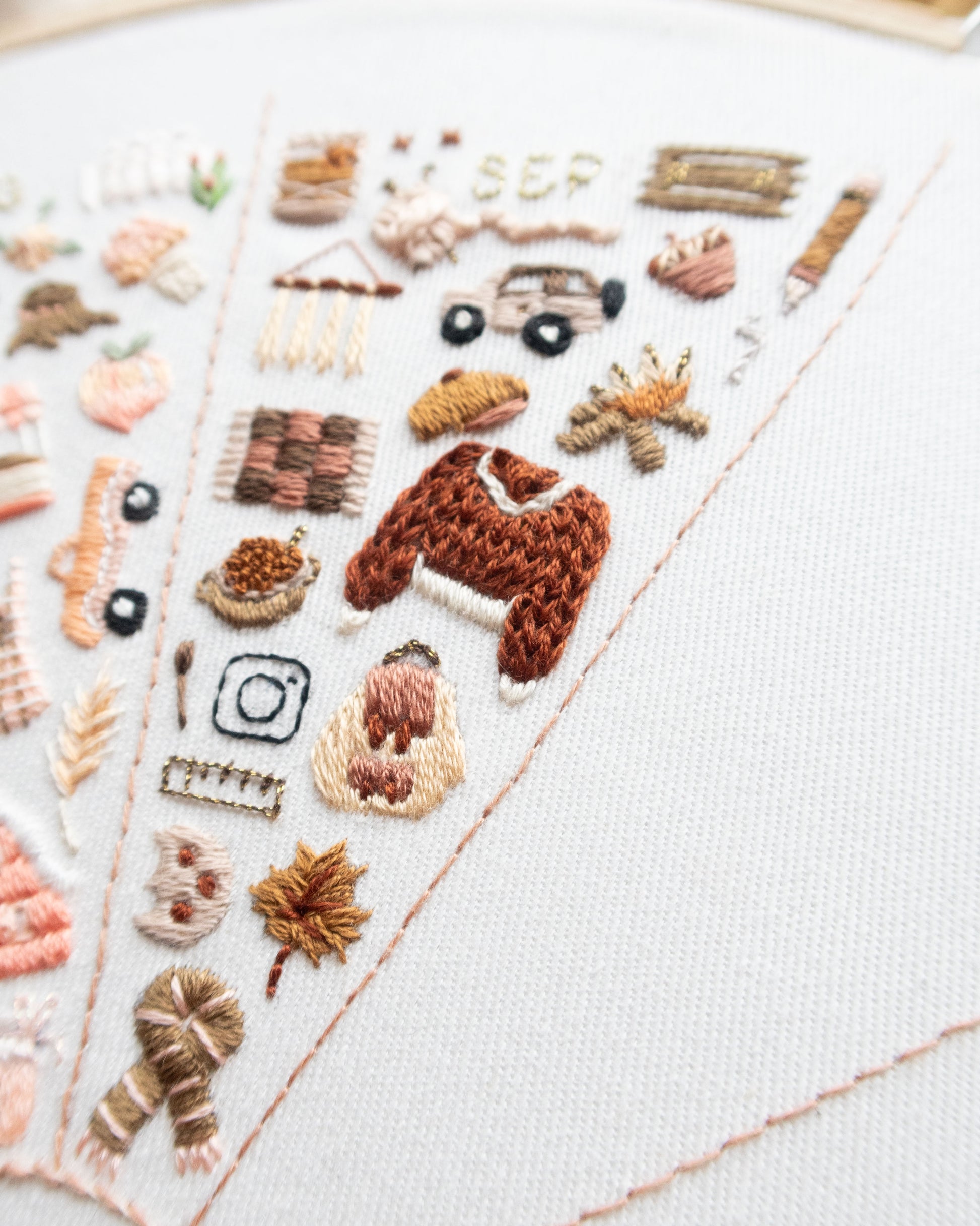 This pattern features 15 detailed, tiny embroidery cozy fall-themed designs for your 2024 Embroidery Journals! This is also a great way to learn new stitches and grow your embroidery skill.