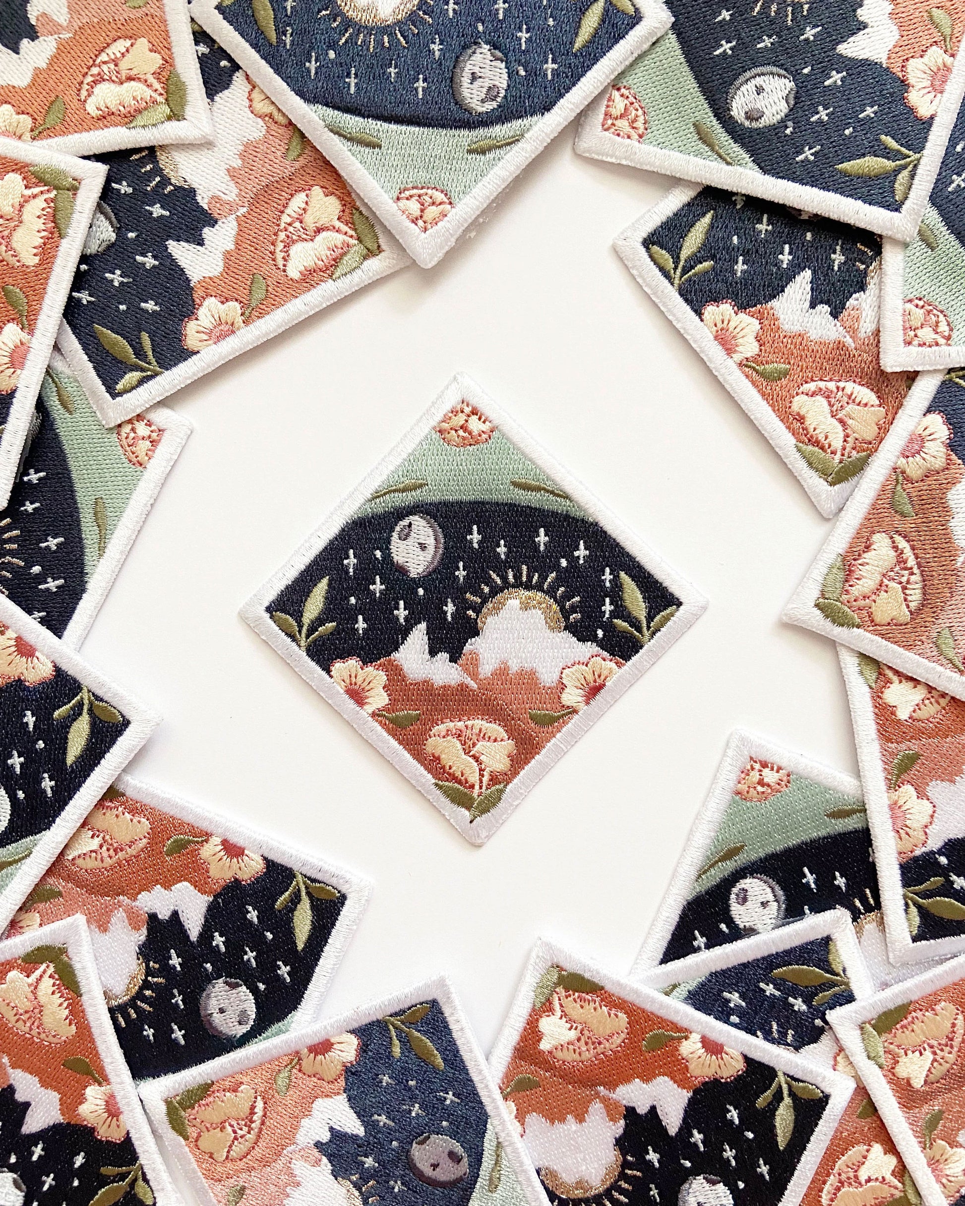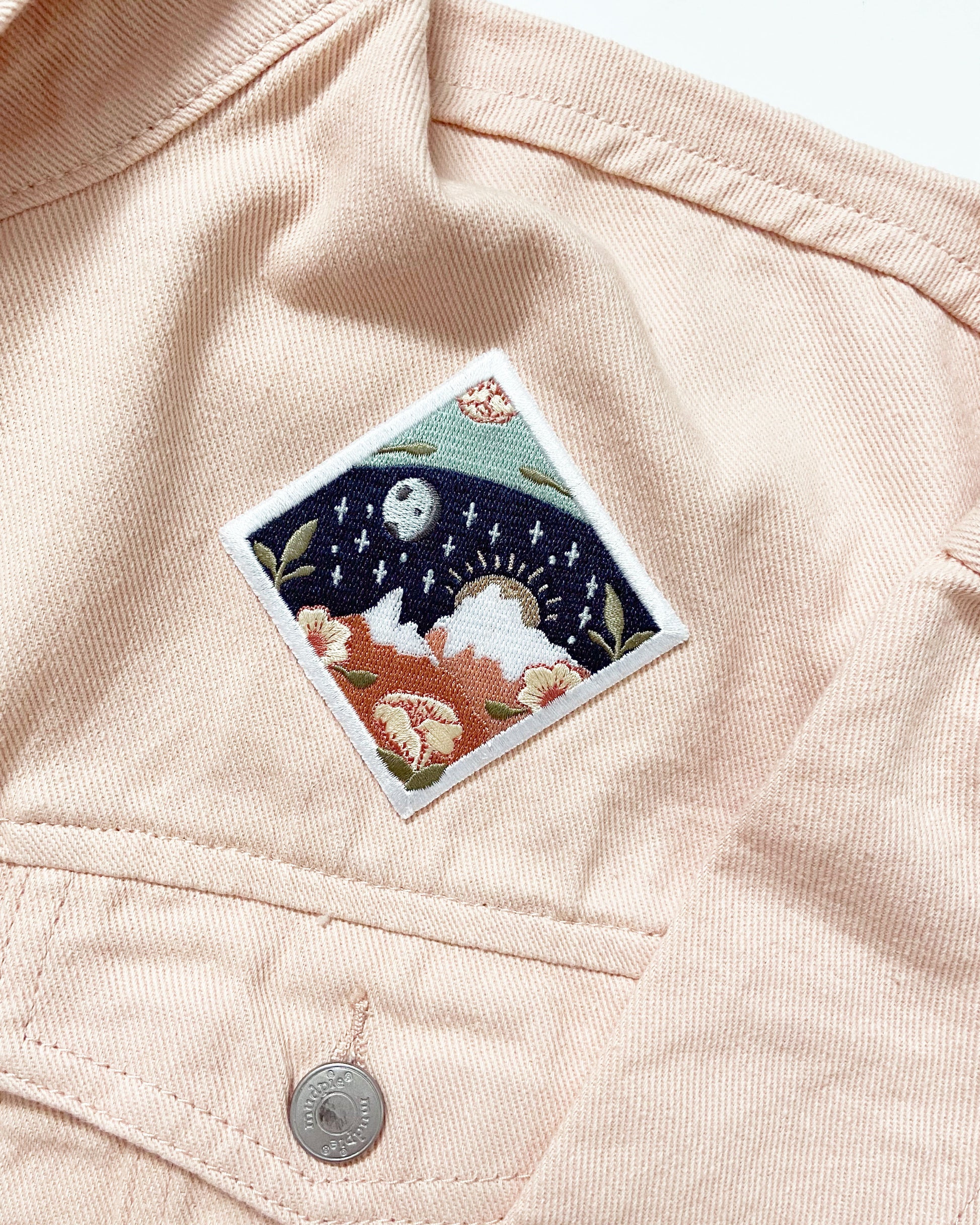 Measuring 3.5x3.5, this iron on embroidered nature patch is an adaptation of hand-embroidery, inspired by Emily June's travels across California and the mountains. Featuring metallic thread, lots of detail, and an iconic diamond shape, this patch is the perfect accessory for any bag, jacket, banner, or more! Simply iron onto your fabric of choice and you are good to go. Made for the lover of nature, travel, exploring, the night sky and florals.