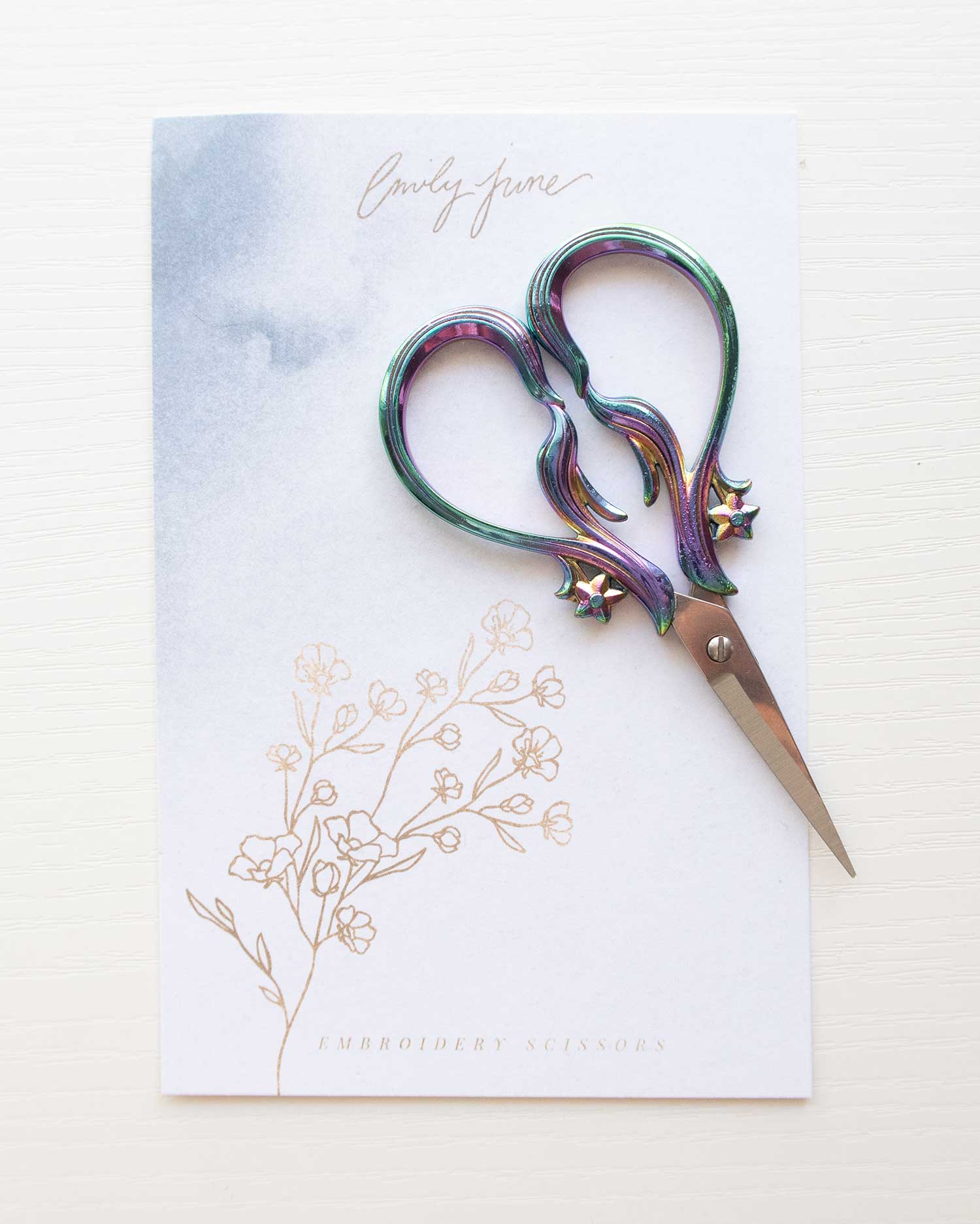 These unique and fanciful scissors feature a rainbow ombre and stars. Sharp and perfect for cutting floss!