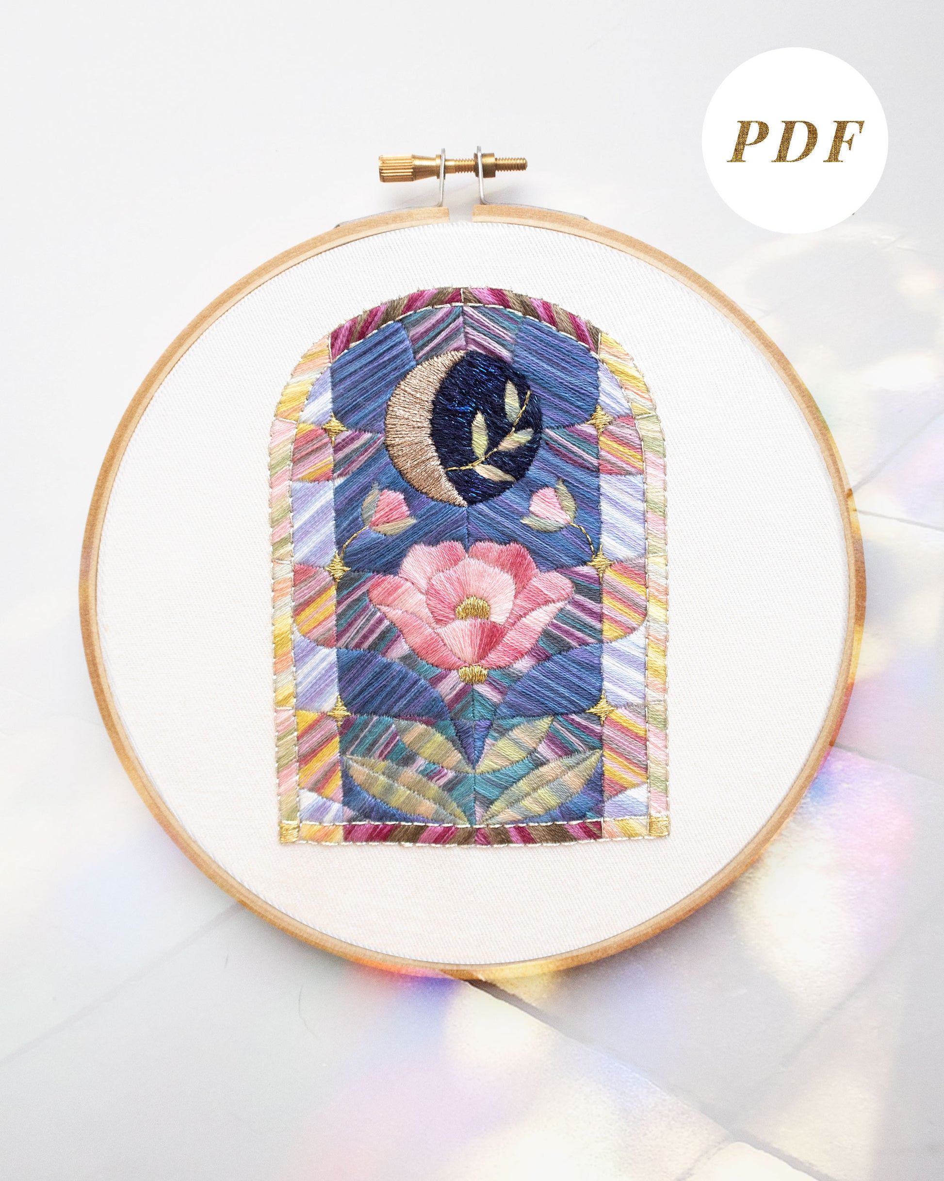 Inspired by fantasy, this stained glass embroidery pattern features only specialty embroidery floss in a magical, moon floral motif. Truly special and a beginner-friendly way to experiment with new kinds of floss!
